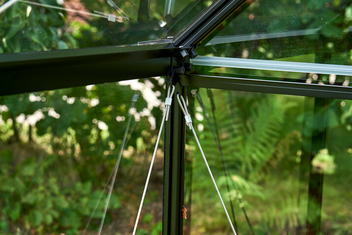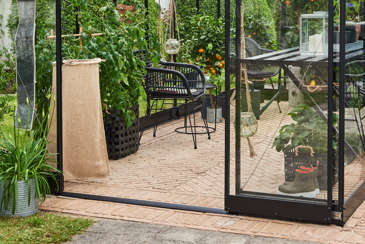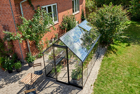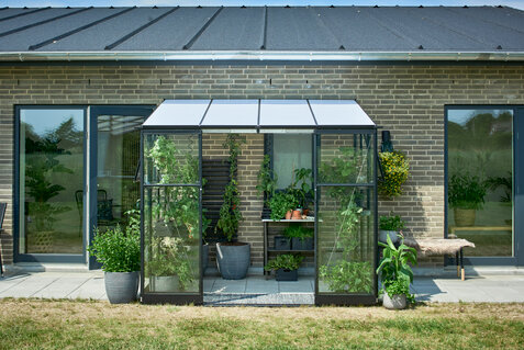 HALLS QUBE LEAN-TO er et vægdrivhus, der monteres op ad husmuren eller en anden bygning. Det gør modellen perfekt til terrasser, gårdhaver og mindre uderum, hvor pladsen skal udnyttes optimalt. Samtidig skaber placeringen tæt på huset en praktisk og tilgængelig løsning, hvor drivhuslivet bliver en naturlig del af hverdagen. Husmuren kan desuden bidrage med varme, som giver gode vækstbetingelser for planterne.