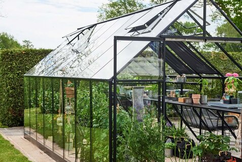 HALLS QUBE 8 er til dig, der ønsker lidt mere albuerum og flere muligheder i indretningen. Her er der plads til flere planter, hylder og arbejdsområder, så du kan få endnu mere ud af drivhuset gennem hele sæsonen. Modellen egner sig godt til dig, der vil bruge dit drivhus aktivt og skabe et funktionelt rum til både dyrkning og haveliv.